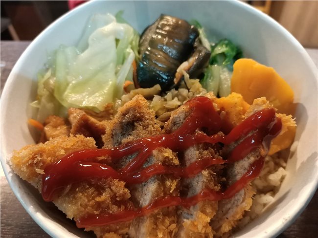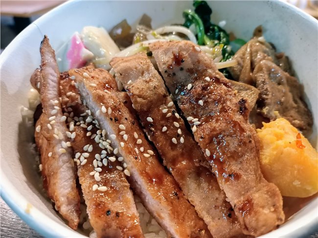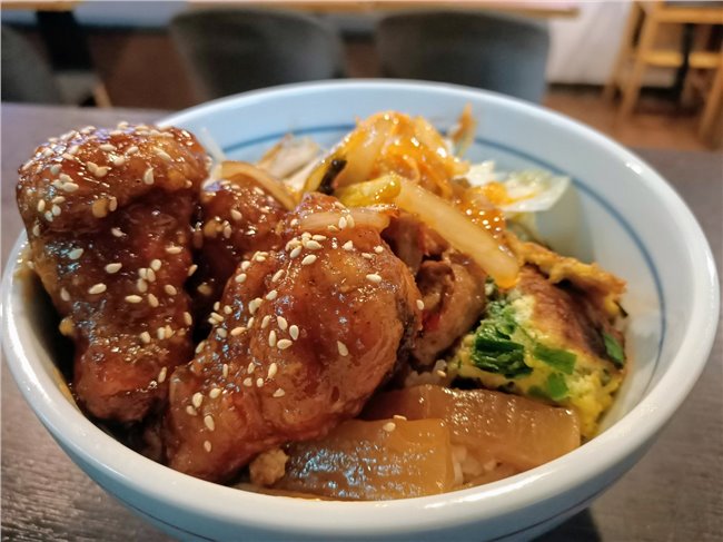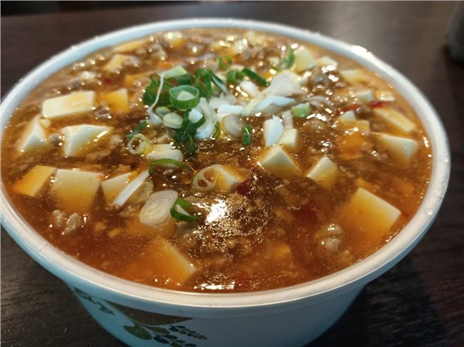 丼飯鋪上厚煎蛋淋上香辣軟嫩的麻婆豆腐